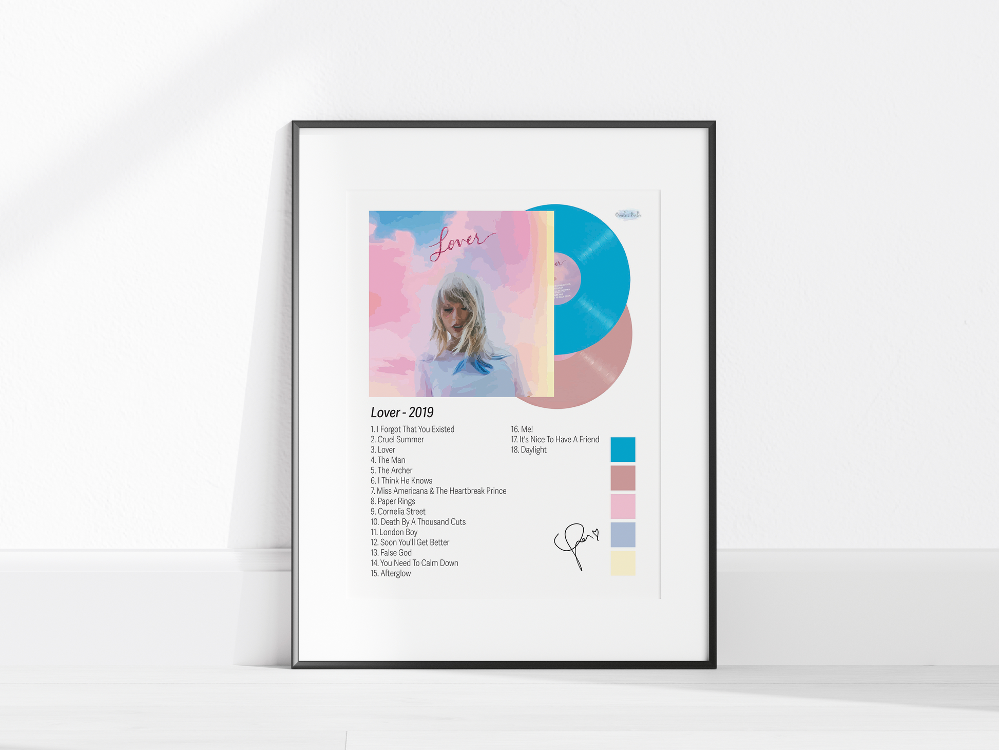 Float into the pastel-dream world of Lover with this illustrated album poster — featuring the iconic cotton-candy cover art, soft airy tones, full tracklist, and a sweet, romantic color palette. A bright little dose of sunshine and sparkle for any Swiftie wall.